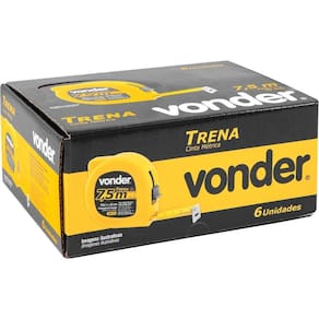 Marca: VonderConteúdo da Embalagem:1 Caixa expositora com 6 trenasDestaques e diferenciais:Possui estojo anatômico em ABS de alta resistência. Fita em aço com graduação em milímetros e polegadas, além de pintura brilhante e numeração contínua, agilizando a leitura e proporcionando maior precisão. Possui trava da fita que facilita a leitura e presilha para cinto auxiliando no transporte durante o uso. Com gancho ajustável na ponta da fita, permitindo medições internas e externas mais precisas.Aplicações e dicas de uso:Indicada para medições em geral. Não possui alça em nylon.Características Técnicas:Comprimento da trena: 7,5 m Revestimento da fita da trena: Pintado Graduação da trena: mm/pol Material da caixa da trena: ABS de alta resistência Marca: Não Informado