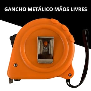 A trena acompanha um suporte para que você possa encaixar a trena nele, e colocar em sua roupa para ficar com as mãos livres quando desejar.
