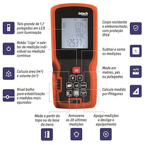 dimensões com exatidão- Visor grande com iluminação ? Tela de LCD de 1,7″, que auxilia em locais com pouca luminosidade- Sinal sonoro ? Indica início e término das medições.Compacta e fácil de transportar, pesa apenas 100gramas e acompanha bolsa em lona