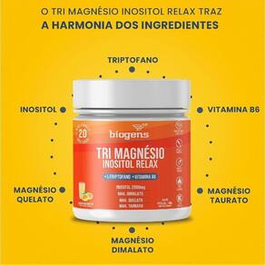 Trimagnésio inositol relax biogens é um suplemento formulado para uma excelente absorção no organismo. Tem em sua composição l-triptofano, inositol e vitamina b6 além das 3 formas especiais de magnésio, sendo estes, magnésio dimalato que vem da associação a duas moléculas de ácido málico, magnésio quelato ou bisglicinato vem da associação a duas moléculas de aminoácidos glicina e o magnésio taurato que vem da associação ao aminoácido de taurina. Essas associações tornam o mineral biodisponível e atuam diretamente no aumento da velocidade de absorção.