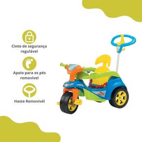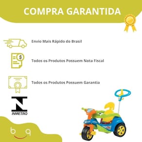 Benefícios: -Rodas largas com calotas e faixas de rodagem em relevo; -Apoio confortável removível para os braços com conjunto didático, e também, contém porta mamadeira; -Apoio para os pés removível com proteção; -Roda dianteira com sistema de pedais removíveis; -Cinto de segurança regulável de três pontos; -Porta objetos na parte traseira; -Haste articulada removível em aço carbono resistente com porta copo e gancho para pendurar sacolas; -Guidão com manoplas; -Assento anatômico antiderrapante com encosto regulável; -Encosto de cabeça regulável.