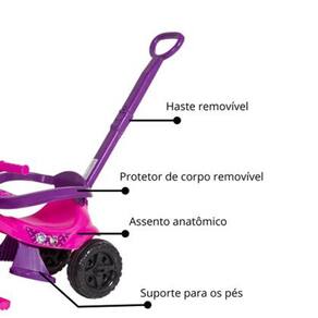O produto inclui pedal, encosto para os pés, protetor e haste para empurrar, todos ajustáveis e destacáveis para atender às diferentes fases de desenvolvimento da criança.