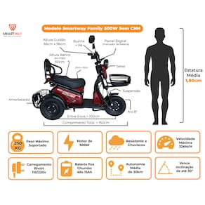 Triciclo Elétrico Smartway Family 500, Autonomia 25 km, Sem CNH Transforme seu deslocamento diário com o Triciclo Elétrico Smartway Family 500. Sustentável, eficiente e perfeito para quem busca mobilidade urbana sem necessidade de CNH! Especificações Técnicas Marca: Smartway Modelo: Family 500 Potência do Motor: 500W (ideal para trajetos urbanos) Velocidade Máxima: Até 32 km/h (ajustada para conforto e segurança) Bateria: 48V de ciclo profundo, Corrente: 15A Autonomia: Até 25 km (varia conforme peso do condutor e terreno) Tempo de Recarga: Aproximadamente 6 horas Peso do Produto: Aproximadamente 75 kg com bateria Peso Máximo Suportado: Até 250 kg Tamanho (com caixa): 150 x 70 x 65 Características Especiais Acelerador de Punho 3 Módulos de Velocidade Alarme com Partida Remota Painel Digital com Marcador de Velocidade Faróis de LED e Setas Traseiras e Dianteiras para Segurança Itens Inclusos 1x Triciclo Elétrico Smartway Family 500 1x Carregador Bivolt 1x Kit Chave 1x Kit Alarme 1x Par de Retrovisores 1x Kit Chave para travamento de roda traseira PRAZO DE ENTREGA APÓS A EXPEDIÇÃO 8 Dias Úteis: Região Sudeste (Capital); 10 Dias Úteis: Região Sudeste (Demais Regiões); Região Sul (Capital); 12 Dias Úteis: Região Sul (Demais Regiões); Região Nordeste (Capital) 15 Dias Úteis: Rio de Janeiro; Região Nordeste (Demais Regiões); Região Centro-Oeste (Capital); 18 Dias Úteis: Região Centro-Oeste (Demais Regiões); Região Norte (Capital); 23 Dias Úteis: Região Norte (Demais Regiões);
