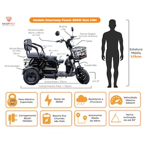 Triciclo Elétrico Smartway Power 600 , Autonomia 30km, Sem CNHTransforme seu deslocamento diário com o Triciclo Elétrico Smartway Power 600. Sustentável, eficiente e perfeito para quem busca mobilidade urbana sem necessidade de CNH!Perguntas Frequentes1. Scooters elétricas podem circular na chuva?- Sim, mas apenas em chuvas leves, como garoas. Não é recomendado utilizá-las em chuvas intensas para evitar danos aos componentes.2. Qual é a autonomia e o tempo de carga de uma scooter elétrica?- A autonomia média é de aproximadamente 30km (considerando peso de 80kg e via com pequenas inclinações), com tempo de recarga em torno de 6 horas. A bateria possui um indicador que sinaliza quando está totalmente carregada. (verificar descrição)3. É necessário ter habilitação (CNH) para conduzir uma scooter elétrica?- Nossos modelos são autopropelidos e, de acordo com a Resolução CONTRAN 996/23, não é necessário possuir CNH para conduzi-los. Para mais detalhes, consulte a própria resolução.4. Qual é a capacidade de peso suportada por uma scooter elétrica?- A capacidade de peso varia de acordo com o modelo. Consulte a descrição do produto para obter detalhes específicos.5. Qual é a velocidade máxima de uma scooter elétrica?- Nossos modelos autopropelidos podem alcançar até 32 km/h, conforme permitido pela Resolução CONTRAN 996/23. Para mais informações, consulte a mesma.6. Qual é a vida útil da bateria de uma scooter elétrica?- Seguindo boas práticas de uso, a bateria tem uma duração média de aproximadamente 500 ciclos completos.7. Scooters elétricas precisam de emplacamento?- Como nossos modelos são autopropelidos, não é necessário emplacamento, conforme a Resolução CONTRAN 996/23. Para mais informações, verifique essa resolução diretamente8. Como devo limpar minha scooter elétrica?- Recomenda-se limpeza a seco com um pano úmido para evitar danos aos componentes elétricos.9. Scooters elétricas precisam de manutenção frequente?- Em média, uma manutenção simples a cada 6 meses é suficiente, desde que seguidas as boas práticas de uso.10. As bicicletas elétricas são adequadas para subidas íngremes?- Sim, nossos produtos podem vencer inclinações de até 30%, desde que respeitado o peso máximo suportado. Favor verificar informação na descrição.11. Como funciona a assistência ao pedal em bicicletas elétricas?- A assistência ao pedal oferece suporte automático ao ciclista enquanto ele pedala, facilitando subidas e longas distâncias.12. A bicicleta elétrica vem montada?- O produto é enviado parcialmente montado. A finalização da montagem é simples e envolve apenas alguns ajustes, como fixar o pneu dianteiro, retrovisores, banco e encosto. Nossa equipe pode fornecer vídeos tutoriais para auxiliar, e, em caso de dúvidas, nosso técnico está disponível para suporte durante o horário comercialEspecificações Técnicas- Marca: Smartway- Modelo: Power 600- Potência do Motor: 600W (ideal para trajetos urbanos)- Velocidade Máxima: Até 32 km/h (ajustada para conforto e segurança)- Bateria: 48V de ciclo profundo, Corrente: 15A- Autonomia: aproximadamente 30km (considerando peso de 80kg e via com pequenas inclinações),- Tempo de Recarga: Aproximadamente 6 horas- Aro: 14 (para maior estabilidade e conforto)- Peso do Produto: Aproximadamente 89 kg com bateria- Peso Máximo Suportado: Até 250 kg- Tamanho (com caixa): 200 x 71 x 77Características Especiais- Acelerador de Punho- 3 Módulos de Velocidade- Alarme com Partida Remota- Painel Digital com Marcador de Velocidade- Faróis de LED e Setas Traseiras e Dianteiras para Segurança- Descanso Lateral e TraseiroItens Inclusos- 1x Triciclo Elétrico Smartway Power 600- 1x Carregador Bivolt- 1x Kit Chave- 1x Kit Alarme- 1x Par de RetrovisoresInformações sobre Legislação e Segurança- Autopropelido e Sem CNH: De acordo com a legislação atual (Resolução CONTRAN 996/23), a Bicicleta Elétrica Power 600 dispensa a necessidade de CNH e emplacamento, garantindo praticidade e acessibilidade para usuários de todas as idades.- Recomendações de Uso: Uso de capacete e respeito às normas de trânsito.Termos de Uso e Garantia- Garantia de 90 dias contra defeitos de fabricação- Cuidados com Bateria: Para maior durabilidade, a primeira carga deve ser de 8 horas, e as cargas subsequentes não devem ultrapassar 6 horas**ATENÇÃO: As nossas baterias podem permanecer sem receber carga por um período de até 5 dias, desde que não estejam completamente descarregadas- Resistência à Água: Ideal para uso em clima urbano, resistente a chuvas leves (chuva fraca, garoa), mas NÃO é à prova d’águaNÃO RECOMENDAMOS uso em chuvas fortes ou longa exposição à água, sob pena de invalidade da garantia- Para lavagem: Prefira lavagem a seco, pano úmido**ATENÇÃO: Jamais submerja o produto em profundidade superior as rodas e permita que o produto fique exposto à chuvas fortes.PRAZO DE ENTREGA APÓS A EXPEDIÇÃO- 8 Dias Úteis: Região Sudeste (Capital);- 10 Dias Úteis: Região Sudeste (Demais Regiões); Região Sul (Capital);- 12 Dias Úteis: Região Sul (Demais Regiões); Região Nordeste (Capital)- 15 Dias Úteis: Rio de Janeiro; Região Nordeste (Demais Regiões); Região Centro-Oeste (Capital);- 18 Dias Úteis: Região Centro-Oeste (Demais Regiões); Região Norte (Capital);- 23 Dias Úteis: Região Norte (Demais Regiões);**Atenção: O prazo pode sofrer variações, mas não se preocupe, lhe manteremos informados. Contamos com a colaboração