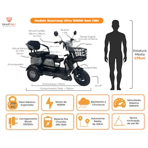 Triciclo Elétrico Smartway Ultra 1000, Autonomia 25 km, Sem CNH Transforme seu deslocamento diário com o Triciclo Elétrico Smartway Ultra 1000. Sustentável, eficiente e perfeito para quem busca mobilidade urbana sem necessidade de CNH! Perguntas Frequentes 1. Bicicletas elétricas podem circular na chuva? Sim, mas apenas em chuvas leves, como garoas. Não é recomendado utilizá-las em chuvas intensas para evitar danos aos componentes. 2. Qual é a autonomia e o tempo de carga de uma bicicleta elétrica? A autonomia média é de aproximadamente 25 km, com tempo de recarga em torno de 6 horas. A bateria possui um indicador que sinaliza quando está totalmente carregada. (verificar descrição) 3. É necessário ter habilitação (CNH) para conduzir uma Bicicleta elétrica? Nossos modelos são autopropelidos e, de acordo com a Resolução CONTRAN 996/23, não é necessário possuir CNH para conduzi-los. Para mais detalhes, consulte a própria resolução. 4. Qual é a capacidade de peso suportada por uma Bicicleta elétrica? A capacidade de peso varia de acordo com o modelo. Consulte a descrição do produto para obter detalhes específicos. 5. Qual é a velocidade máxima de uma bicicleta elétrica? Nossos modelos autopropelidos podem alcançar até 32 km/h, conforme permitido pela Resolução CONTRAN 996/23. Para mais informações, consulte a mesma. 6. Qual é a vida útil da bateria de uma bicicleta elétrica? Seguindo boas práticas de uso, a bateria tem uma duração média de aproximadamente 450 ciclos completos. 7. Bicicleta elétricas precisam de emplacamento? Como nossos modelos são autopropelidos, não é necessário emplacamento, conforme a Resolução CONTRAN 996/23. Para mais informações, verifique essa resolução diretamente 8. Como devo limpar minha bicicleta elétrica? Recomenda-se limpeza a seco com um pano úmido para evitar danos aos componentes elétricos. 9. Bicicleta elétricas precisam de manutenção frequente? Em média, uma manutenção simples a cada 6 meses é suficiente, desde que seguidas as boas práticas de uso. 10. As bicicletas elétricas são adequadas para subidas íngremes? Sim, nossos produtos podem vencer inclinações de até 30%, desde que respeitado o peso máximo suportado. Favor verificar informação na descrição. 11. Como funciona a assistência ao pedal em bicicletas elétricas? A assistência ao pedal oferece suporte automático ao ciclista enquanto ele pedala, facilitando subidas e longas distâncias. 12. A bicicleta elétrica vem montada? O produto é enviado parcialmente montado. A finalização da montagem é simples e envolve apenas alguns ajustes, como fixar o pneu dianteiro, retrovisores, banco e encosto. Nossa equipe pode fornecer vídeos tutoriais para auxiliar, e, em caso de dúvidas, nosso técnico está disponível para suporte durante o horário comercial Especificações Técnicas Marca: Smartway Modelo: Ultra 1000 Potência do Motor: 1000W (ideal para trajetos urbanos) Velocidade Máxima: Até 25 km/h (ajustada para conforto e segurança) Bateria: 48V de ciclo profundo, Corrente: 15A Autonomia: Até 32 km (varia conforme peso do condutor e terreno) Tempo de Recarga: Aproximadamente 6 horas Peso do Produto: Aproximadamente 89 kg com bateria Peso Máximo Suportado: Até 250 kg Tamanho (com caixa): 200 x 71 x 77 Características Especiais Acelerador de Punho 3 Módulos de Velocidade Alarme com Partida Remota Painel Digital com Marcador de Velocidade Faróis de LED e Setas Traseiras e Dianteiras para Segurança Suporta até 3 passageiros: Dois adultos e uma criança Itens Inclusos 1x Triciclo Elétrico Smartway Ultra 1000 1x Carregador Bivolt 1x Kit Chave 1x Kit Alarme 1x Par de Retrovisores Termos de Uso e Garantia Garantia de 90 dias contra defeitos de fabricação Cuidados com Bateria: Para maior durabilidade, a primeira carga deve ser de 8 horas, e as cargas subsequentes não devem ultrapassar 6 horas **ATENÇÃO: As nossas baterias podem permanecer sem receber carga por um período de até 5 dias, desde que não estejam completamente descarregadas Resistência à Água: Ideal para uso em clima urbano, resistente a chuvas leves (chuva fraca, garoa), mas NÃO é à prova d’água, NÃO RECOMENDAMOS uso em chuvas fortes ou longa exposição à água, sob pena de invalidade da garantia Para lavagem: Prefira lavagem a seco, pano úmido PRAZO DE ENTREGA APÓS A EXPEDIÇÃO 8 Dias Úteis: Região Sudeste (Capital); 10 Dias Úteis: Região Sudeste (Demais Regiões); Região Sul (Capital); 12 Dias Úteis: Região Sul (Demais Regiões); Região Nordeste (Capital) 15 Dias Úteis: Rio de Janeiro; Região Nordeste (Demais Regiões); Região Centro-Oeste (Capital); 18 Dias Úteis: Região Centro-Oeste (Demais Regiões); Região Norte (Capital); 23 Dias Úteis: Região Norte (Demais Regiões);