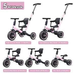 5 modos: Modo Push Tricycle, Modo Push Balance Bike, Modo Triciclo, Modo Balance Bike e Modo Bike. O triciclo multifuncional é adequado para meninos e meninas de 1, 2,3 anos. Guiador de direção: girando 135 graus para controlar e dirigir a velocidade e direção do triciclo. Protegendo seu filho de cair e se machucar. Também pode ser ajustado de acordo com a altura dos pais para que papai e mamãe possam acompanhar os treinos com seu pequeno. Guiador, assento e pedais ajustáveis: Pressione o botão vermelho para ajustar o guiador e o assento. Existem 3 posições para colocar os pedais ao transformar diferentes modos. Estrutura de aço carbono e rodas EVA: aprovadas pela EN188 e ASTM. Feito de aço carbono de alta qualidade, rodas sólidas de absorção de choque em EVA e assento em PP ecológico. Vida duradoura, design durável e elegante. Fácil acesso de uso: Muito mais fácil de montar guiador e rodas. Pressione os botões para convertê lo em diferentes modos. Adequado para crianças de 1 a 3 anos com menos de 110 centímetros 43,3 polegadas Marca: Não Informado