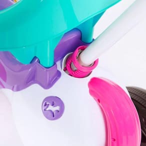 - O Triciclo vem com pedal para apoio dos pés, o chifre do unicórnio tem luz, e da para ouvir lindas melodias o que dá asas à imaginação.