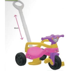 - Conteúdo da embalagem: - 1 Triciclo - 1 Haste de Empurrar de 65cm distância do encaixe - 1 anel de proteção - 1 apoio de pés - Dimensões aproximadas do produto montado sem haste A x L x C : 41 cm x 40 cm x 55 cm; - Material: Plástico