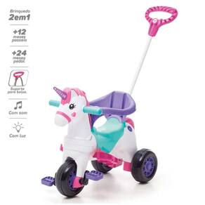 CARACTERISTICAS DO PRODUTO: - Calesita Fantasy é um mágico unicórnio com rodinhas para meninos e meninas. - Colorido e muito confortável, é o companheiro ideal de grandes aventuras no mundo dos sonhos. - O Triciclo vem com pedal para apoio dos pés, o chifre do unicórnio tem luz, e da para ouvir lindas melodias o que dá asas à imaginação. - Além de ser uma opção para um passeio divertido e lúdico, o Calesita Fantasy estimula a coordenação motora de braços e pernas dos pequenos.