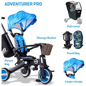 Portátil e conveniente: o recurso dobrável exclusivo do Trixplorer Adventure Pro facilita o transporte e o zenamento. Ele vem com capa de chuva, bolsa para os pais, bolsa de viagem e cesta para maior comodidade durante suas aventuras ao ar livre.