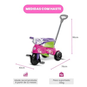 Características - Marca: Calesita - Modelo: Tatetico - Código: 0939 - Cor: Rosa - Função Empurrador: Ideal para crianças a partir de 12 meses. - Função Pedal: Adequado para crianças a partir de 24 meses. - Peso Suportado: Até 30Kg, acompanhando a criança em diferentes fases de seu crescimento. - Triciclo 2 em 1: Versatilidade que se adapta ao desenvolvimento do seu filho.