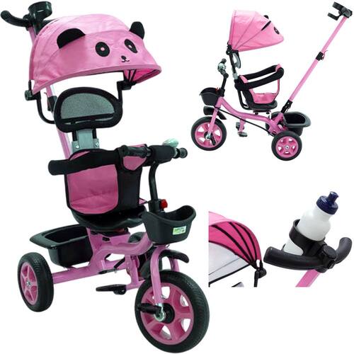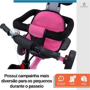 Triciclo Infantil Empurrador 2 em 1 Carrinho de Passeio Bebê Capota 50kg Guia Auxiliar Cesto Rodas Rosa