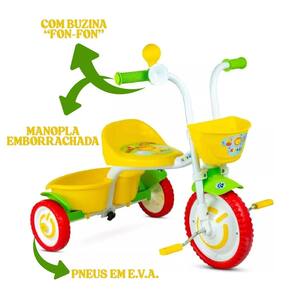 Características: - Quadro, garfo e guidão em alumínio; - Pneus em E.V.A.; - Manoplas em elastômero TPE atóxico; - Limitador de giro do guidão; - Cestinha ou plaquinha; - Buzina “fon-fon”.