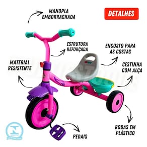 Triciclo infantil rosa - diversão e estilo para crianças Triciclo infantil rosa Você já notou como é fundamental para as crianças explorarem o ambiente ao seu redor Sem um brinquedo apropriado, elas podem perder a chance de desenvolver habilidades essenciais, como equilíbrio e coordenação, enquanto se divertem. O triciclo infantil rosa é a escolha ideal para pequenos aventureiros com um design encantador e cores vibrantes, ele não apenas chama a atenção, mas também garante segurança e conforto. Cada pedalada contribui para o desenvolvimento da coordenação motora e da autonomia, permitindo que as crianças se sintam confiantes enquanto brincam, tanto em casa quanto ao ar livre. Benefícios - promove o desenvolvimento motor e a independência - design seguro e confortável para longas horas de brincadeira - acompanha o crescimento da criança com assento ajustável - perfeito para uso em ambientes internos e externos Especificações técnicas - altura do triciclo: aproximadamente 55cm - comprimento do triciclo: aproximadamente 62cm - comprimento do guidão: aproximadamente 41cm - peso aproximado: 2,500kg - registro inmetro: 002966/2021 Conteúdo da embalagem - 01 triciclo infantil - rosa Não perca a oportunidade de proporcionar momentos incríveis de aventura e aprendizado para seu filho adquira já o triciclo rosa e veja a felicidade em cada pedalada Informações importantes sobre a compra - com de fábrica Dúvidas frequentes: 2 - em quanto tempo meu pedido será enviado 3 - é seguro realizar esta compra Resposta: desde a fundação da nossa empresa, já atendemos milhares de clientes satisfeitos em outras lojas online. Somos uma loja oficial neste marketplace. Além de todas as garantias da plataforma, oferecemos também de fábrica. 4 - os produtos têm Resposta: sim, oferecemos de 30 dias em todos os nossos produtos. Se houver qualquer problema, resolveremos da melhor forma possível. 5 - esta compra é segura Resposta: sim, garantimos total segurança na sua compra e a privacidade dos seus dados. 6 - e se eu não gostar do produto, terei meu dinheiro de volta Resposta: de acordo com o cdc código de defesa do consumidor , todo cliente de compras online tem até 7 dias para devolver o produto em caso de arrependimento, sem custo na devolução. Você será reembolsado em 100% do valor da compra. Caso tenha alguma dúvida, envie-nos uma mensagem e responderemos o mais rápido possível. Marca: Não Informado Ean: 7896482199775