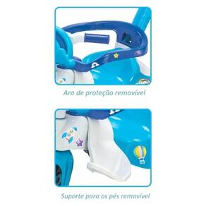 Com um assento anatômico que assegura conforto, o triciclo também conta com proteção lateral, suporte para os pés e uma haste removível, oferecendo versatilidade e segurança em cada fase de crescimento.
