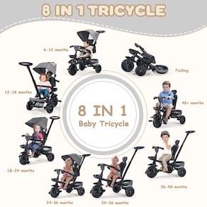 - [Design versátil 8 em 1]: de um triciclo de carrinho de bebê a um triciclo clássico para bebês, este triciclo tem capacidade de ajuste 8 em 1 e pode ser convertido em vários modos para atender às necessidades de seu filho em diferentes estágios de desenvolvimento. Também possuem um assento giratório de 360°, os triciclos de pressão para crianças de 1 a 3 anos permitem que seu filho vire direções diferentes enquanto dirige.