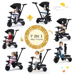Triciclo infantil Kinder King, triciclo infantil dobrável 7 em 1 com alça ajustável, assento giratório, dossel ajustável, cinto de segurança, armazenamento, carrinho de bebê para maiores de 6 meses, preto