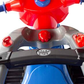 Possui pedal de metal, buzina, guidão com punhos emborrachados e apoio de pés removível.