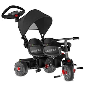 O assento duplo vem com encosto mais alto para maior conforto e suporte, enquanto a capota articulável e removível protege as crianças do sol. Outros recursos incluem uma caçamba traseira basculante para armazenar brinquedos, manoplas em TPE atóxico, e vários suportes para bolsa, garrafa, mamadeira, e até um porta-celular.