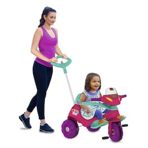 Triciclo Velobaby Passeio e Pedal Rosa BandeiranteO Velobaby Passeio e Pedal é prático e divertido, oferecendo duas formas de uso: no modo passeio, o adulto conduz com a haste direcionável, e no modo pedal, a criança pode pedalar livremente. A transição entre as funções é simples: basta remover a haste, o cercado de proteção e o apoio para os pés.
