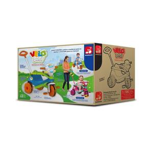 Possui ainda dispositivo de roda livre que transforma o pedal em apoio para os pés das crianças enquanto o triciclo é movimentado.