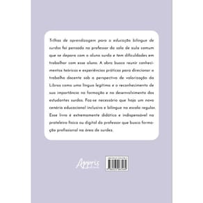 Trilhas de aprendizagem para a educação bilíngue de surdos foi pensado no professor da sala de aula comum que se depara com o aluno surdo e tem dificuldades em trabalhar com esse aluno. A obra busca reunir conhecimentos teóricos e experiências práticas para direcionar o trabalho docente sob a perspectiva de valorização da Libras como uma língua legítima e o reconhecimento de sua importância na formação e no desenvolvimento dos estudantes surdos. Faz-se necessário que haja um novo cenário educacional inclusivo e bilíngue na escola regular. Esse livro é extremamente didático e indispensável na prateleira física ou digital do professor que busca formação profissional na área de surdez.