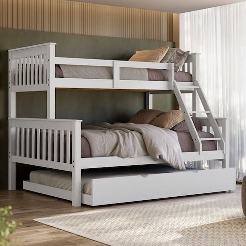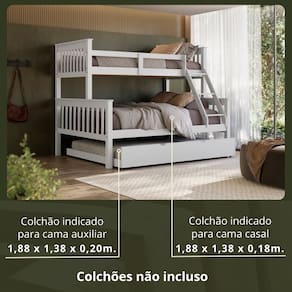 Modelo: WBL105T00246 Material: Madeira Maciça de Pinus de Reflorestamento e MDF de 2,2cm de espessura Pintura/Acabamento: Laca Branco/Castanho 30% de Brilho, Podendo Aparecer os Veios da Madeira Medidas dos Colchões da Cama de Solteiro (cm x cm x cm): 188x88x20 (Não Incluso) Medidas dos Colchões da Cama de Casal (cm x cm x cm): 188x138x18 (Não Incluso) Medidas dos Colchões da Cama Auxiliar de Casal (cm x cm x cm): 188x138x20 (Não Incluso) Peso Suportado Cama de Solteiro: 120 Kg Peso Suportado Cama de Casal: 240 Kg Peso Suportado na cama auxiliar: 240 kg Acessórios: Escada Fixa Cama auxiliar com rodízios Altura entre camas: 86cm