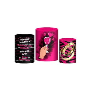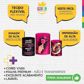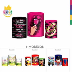 Trio capas cilindros sublimado despedida de solteira veste fácil Medida do trio de capa para cilindro:Tamanho p: a altura: 48cm // d diâmetro: 39cm // c circunferência: 122cmTamanho m: a altura: 60cm // d diâmetro: 45cm // c circunferência: 141cmTamanho g: a altura: 80cm // d diâmetro: 51cm // c circunferência: 160cm Acabamento com elástico Não acompanha cilindro em mdf Chegou a novidade que todos esperavam, o kit capa de cilindro de tecido da decor. Com a mesma qualidade de nossos painéis, para unificar aos painéis e dar mais charme a sua festa. Assim como nossos painéis são impressos em tecido dando uma sensação de realidade para o ponto principal da decoração. Mais detalhes: - veste fácil. Ágil para instalar- não reflete luz do flash.- lavável.- pode ser passado a ferro.- fácil transporte e armazenamento. Observações importantes: -as alterações devem ser solicitadas antes da compra, sujeitas a cobranças adicionais Vantagens dos painéis e capas de cilindros:Conheça, a seguir, as principais vantagens de adotar os painéis de tecido sublimado em sua festa -não deformaO tecido não deformam com o tempo, garantindo economia ao longo prazo. O tecido também não apresenta vincos, não amassa e pode ser lavado sem perder a qualidade de sua impressão. -sem brilhoEm ambientes iluminados, o tecido não reflete a luz, o que poderia deixar parte da capa ofuscado pelo brilho da iluminação local. -não retém águaO tecido de poliéster tem um grau de absorção da água muito baixo, em torno de 0,5%. Ele não molha como qualquer outro material, e mesmo aconteça, tem a capacidade de secar muito rapidamente, além de boa resistência à abrasão e aos solventes orgânicos. Marca: Prime Decor Festas