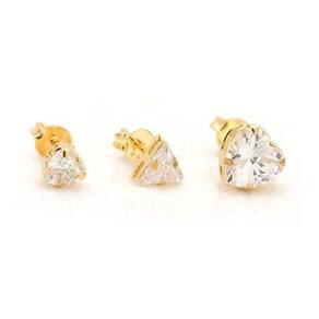 Brinco folheado a ouro com zircônia. Este anúncio é para 3 pares 6 peças . Tamanhos: coração de 6 mm triângulo de 5 mm ponto de luz de 4 mm lindo para crianças, segundo furo e terceiro furo. Consulte o logo abaixo do valor do produto.