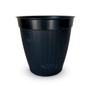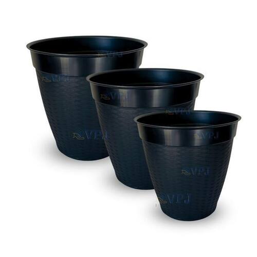 descrição: o kit compõem 01 vaso 30 l, 01 vasos 21 l e 01 vaso 14,5 l 14,5 litros l x a : 32x30 cm e base: 19 21 litros l x a : 36x32 cm e base: 23 30 litros l x a : 42x35 cm e base: 26 material: polipropileno modelo: redondo rattan cores: preto quantidade: 3 Marca: Plásticos Pln