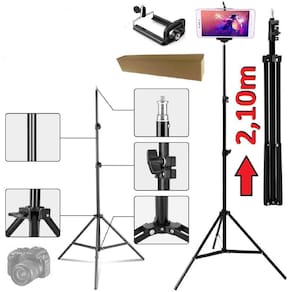Tripé 2,10m profissional câmera e celular pedestal robusto para iluminador luz ring light + suporte celular youtuber Tripé com eletrônica Tripé 2,10m câmera celular pedestal universal youtuber + suporte celular Tripé robusto de alta qualidade, possui molas internas para amortecimento, braçadeiras reforçadas em nylon, altura de 2,10 mts, abertura dos pés de 88 cm promovendo boa estabilidade, pino 5/8 com rosca 1/4 para usar diversos tipos de equipamentos.Pintura preta, tornando - o mais discreto no ambiente de cine & foto.Reforçado, chegando a suportar 6 kg , pode ser com diversos equipamentos de iluminação. acompanha suporte para celular universal de acompanha . Além disso este tripé é um modelo muito recomendado para utilização junto a equipamentos fotográficos e iluminação, uma vez que possui uma estrutura resistente com composta por materiais de alumínio e partes plásticas, conseguindo alcançar uma altura máxima de 2,10 metros e mínima de 68cm quando totalmente fechado, pesando somente cerca de 780 gramas, sendo portanto, carregado com muita facilidade e praticidade. O tripé de iluminação tpi-200 ainda possui 3 seções e 3 travas, que proporcionam ao usuário uma regulagem na altura, de forma que possibilite ao mesmo criar diversos modos de uso, conforme a necessidade de operação em cada um de seus trabalhos. O kit contém: 1 tripé de até 2,10m de alcance 1 suporte para celular Marca: Não Informado Ean: 7895555444705