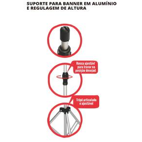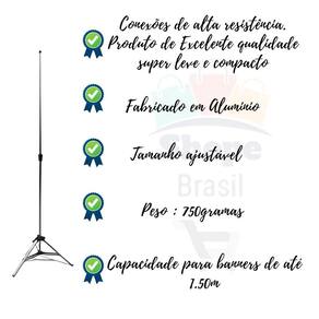Pedestal altura Máxima de 1,80 metros. Base articulada Haste Telescópica Fabricado em alumínio e conexões de alta resistência. Produto de Excelente qualidade super leve e compacto Peso : 750gramas Capacidade para banners de até 1.50m