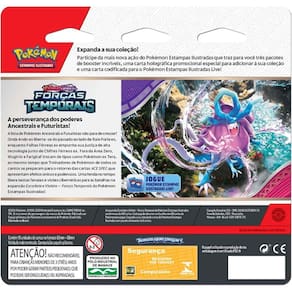 "A lista de Pokémon Ancestrais e Futuristas não para de crescer!Onda Ando ex liberta-se do passado ao lado de Raio Fúria ex, enquanto Folhas Férreas ex empunha sua justiça de alta tecnologia junto de Chifres Férreos ex.Fora da Área Zero, Wugtrio e Farigiraf trocam de tipos como Pokémon ex Tera, ao mesmo tempo que Treinadores de Pokémon de todos os cantos se preparam para o retorno das cartas ACE SPEC que apresentam efeitos únicos e poderosos.Uma fenda no tempo libera bestas ferozes e visões cibernéticas para as batalhas na expansão Escarlate e Violeta — Forças Temporais do Pokémon Estampas Ilustradas!" O Triple Pack contém um total de 19 unidades de cartas, todas no formato padrão de 63mm x 88mm, proporcionando uma experiência emocionante e repleta de estratégias no universo do Pokémon Estampas Ilustradas.