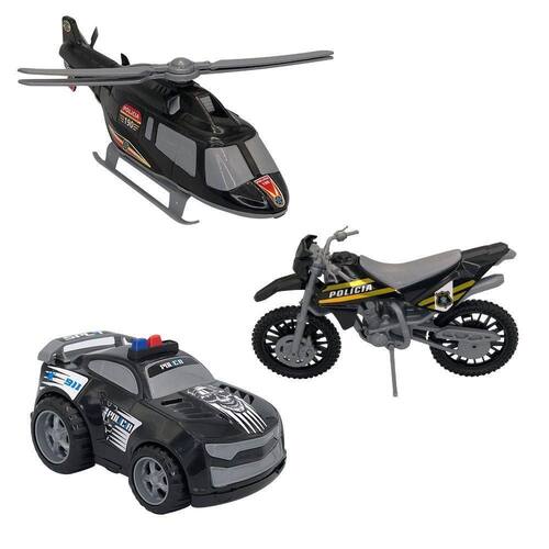 01 KIT DE BRINQUEDO DE POLÍCIA COM CARRO, MOTO E HELICÓPTERO - PRETO