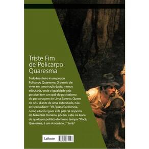 Em 1915, Lima Barreto publica esta que seria considerada a sua obra-prima, Triste Fim de Policarpo Quaresma. Trata-se da história do militar e ufanista Quaresma, cuja maior ocupação é enaltecer o Brasil e suas riquezas. A apaixonada defesa de seus pontos de vista faz com que ele seja considerado um louco. Enquanto isso, o major segue idealizando projetos para conflito entre o reale o ideal acaba surgindo quando todas as suas iniciativas se frustram. o patriota, então, conclui que a culpa de suas desilusões é uma só: os políticos. A saída, para ele, é uma urgente reforma política. Para alcançar sua meta, ele se juntará às tropas do Marechal Floriano - será o início do entendimento do verdadeiro sentimento que move a política.