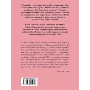 Um mosaico que extrapola a forma narrativa para construir um retrato delicado mas feroz sobre legado, memória e amor na relação entre mãe e filho. Um diário, centenas de fotografias e sessenta e oito cartas é tudo que G. tem de sua mãe, além das lembranças de um passado comum. A caixa de papelão que contém todos esses elementos guarda também as expectativas e as angústias de um filho que tenta construir sua própria identidade e Um diário, centenas de fotografias e sessenta e oito cartas é tudo que G. tem de sua mãe, além das lembranças de um passado comum. A caixa de recuperar o contato que se faz ausente. Partindo em busca dessa mulher -- de quem ela foi antes da maternidade, da mãe que nasceu com ele, dos mistérios da individualidade --, G. revira bulas de remédio, diagnósticos médicos, mapas astrais, redige cartas, e-mails, questiona a si mesmo. E conclui: "Escrevo e envio esta carta para você para tentar reencontrar, em minha própria voz, a tua." Neste sensível e ousado romance de estreia, Gabriel Abreu monta um emocionante quebra-cabeças de registros, afetos e lembranças que apenas um filho, em vias de perder a mãe, pode ter.