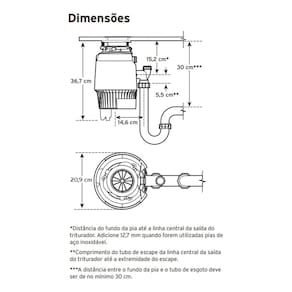 - Tensão 220V: NÃO É BIVOLT. - Amperagem: 10A. - Potência do motor: 0.75HP (50Hz - 60Hz) - 380W. - Motor: monofásico. - Tipo de alimentação: contínua. - Controle liga/desliga: interruptor pneumático. - Capacidade da câmara de trituração de 980ml. - Abertura da pia: 90mm (válvula americana 4 1/2"). - Distância entre entrada esgoto e abertura da pia: 30cm. - Ponto de esgoto: 40 a 50mm. - Tecnologia de trituração de 3 estágios: partículas ainda menores. - Os resíduos alimentares são triturados em pequenas partículas e descartados em segundos. - Seguro para uso com fossas sépticas com manutenção adequada. - Motor de indução de alto torque. - Proteção contra a sobrecarga. - Proteção do motor: reset automático. - Limpo, higiênico, prático, totalmente seguro e simples de usar. - Uso médio de água: aprox. 4L/dia por pessoa. - Fácil de instalar na maioria das pias: tecnologia Lift & Latch. - Solução definitiva para o lar, pois é compacto e fica embaixo da pia sem tomar espaço valioso para armazenamento. - Método fácil de descartar resíduos alimentares no lar, economizando tempo e ajudando a minimizar as idas à lixeira. - Ambientalmente responsável, ajudando a reduzir a quantidade de resíduos destinados aos aterros sanitários. - Consumo médio de energia elétrica: 3-4 KWH por ano. - Conexão do dreno: 1-1/2" (3.81 cm) - junta deslizante com amortecimento.