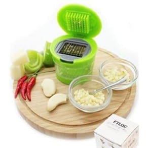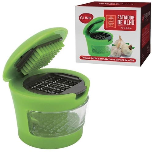 O produto é super prático. Basta colocar o alho na parte superior e fechar a tampa, que em poucos instantes o alho picado cairá no compartimento removível, pronto para ser utilizado no tempero de sua comida.