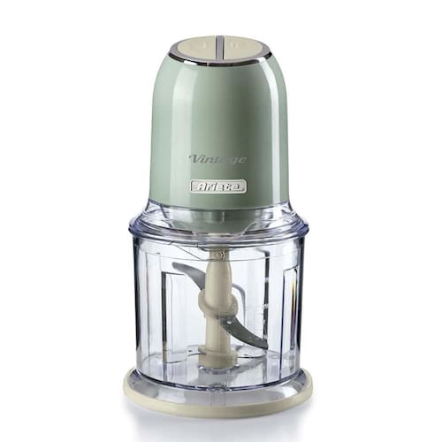 A Linha Vintage da Ariete é enriquecida com um produto essencial para as receitas da sua cozinha: um triturador elétrico com linhas retrô e tons pastéis suaves, perfeito para trazer um toque de estilo e funcionalidade para a sua cozinha. Graças à sua potência de 400 Watts e 4 lâminas de aço inoxidável, o Triturador Vintage permite cortar qualquer ingrediente para as suas receitas: desde legumes a carne, queijo, pão, fruta seca e até mesmo gelo. As 2 velocidades, que podem ser operadas com os dois botões na parte superior do Triturador, permitem cortar finamente os alimentos, enquanto os pés antiderrapantes garantem segurança e a máxima aderência do produto à superfície de trabalho.