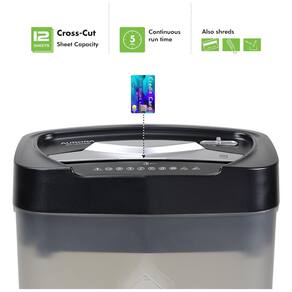 Corte transversal com capacidade para 12 folhas destrói cartões de crédito e pequenos clipes de papel. Destrói papel, cartões de crédito em pedaços pequenos 4, x 39,68 milímetros, nível de segurança P 3. Tempo de execução contínua sem parar de 5 minutos reverso automático anti jam para limpar congestionamentos de papel. Sobrecarga e proteção térmica, interruptor de 4 modos auto, desvio, reverso. Cesta de lixo de 18 litros com luzes indicadoras de LED em espera, superaquecimento Marca: Não Informado
