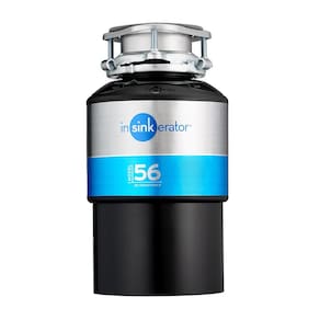 Triturador de resíduos alimentares InSinkErator modelo 56 com tecnologia de trituração de um estágio, motor de indução de alto torque e elementos de trituração em aço inoxidável. Os resíduos alimentares são triturados em pequenas partículas e descartados em segundos