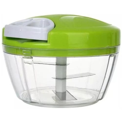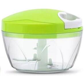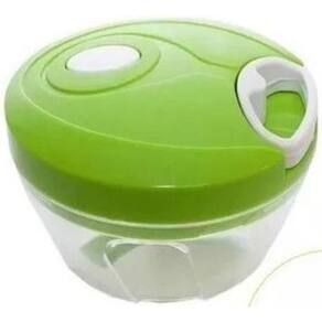 - Material: Polipropileno PP - Poliestireno PS - Aço Inox SS 18/0 - Possui três lâminas Inox para corte; - 1 Tampa plastica com puxador - 1 Pote transparente - Acionamento giratório através de corda retrátil; - Processa os alimentos de forma rápida e eficiente; - Formato anatômico e prático; - Fácil manuseio;