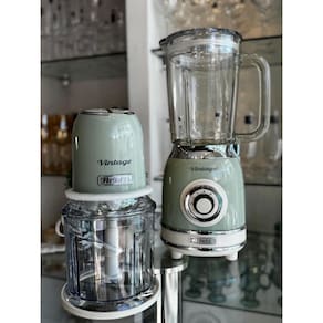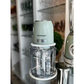 Triturador elétrico com design retrô, 4 lâminas de aço inoxidável, 2 velocidades e pés antiderrapantes.Funções