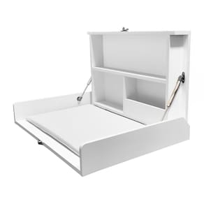 Caracterisricas: - projeção na parede: aberto: 73 cm / fechado: 12cm - dimensões aproximadas: 74x47 cm - capacidade: 52 kg - cor: branco - mdf; - possui buchas e parafusos para fixação na parede; - colchonete almofadado com espessura de 02 cm - fechamento trava metálico; - pistões a gás. - super resistente.