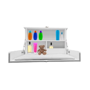 O trocador de fraldas fixo parede é a solução ideal para quem procura praticidade, maior movimento e uma solução inteligente e confortável na troca do bebê, seja no seu ambiente familiar ou comercial. Abertura e fechamento suave, graças aos pistões a gás impedindo que se abra de força brusca, dobradiças na parte interna do trocador e compartimento para shampoos, perfumes e lenços umedecidos.