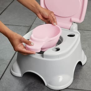 O Fisher-Price® Troninho 3 em 1 'cresce” junto com o seu filho. Começa como uma cadeira com troninho de treino, depois o redutor de assento ajuda a transição de seu filho em idade pré-escolar para usar o vaso sanitário de gente grande. O troninho também se transforma em uma escadinha robusta que ajuda a criança a sentar e levantar do vaso e a alcançar a pia.