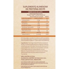 True Vegan Doce De Leite 418G - Treu Source A true vegan é a proteína isolada do arroz e da ervilha que veio atender ao público vegetariano e vegano com muita qualidade e sabor. A true vegan alinha a pureza dos ingredientes ao bem estar e rendimento físico. São 23g de proteína orgânica por dose que fornecem um perfil de todos os aminoácidos essenciais - incluindo 5,5g de bcaas - além de fornecerem 5g de glutamina para servirem de suporte no ganho de massa muscular e na redução do tempo de recuperação após o exercício. A combinação das proteínas de ervilha e do arroz com adição da amêndoa triturada e da chia em pó proporcionam uma cremosidade única. Tendo em vista a recorrente deficiência de vitamina b12 em dietas vegetarianas, o true vegan fornece 100% das necessidades diárias desta vitamina. Com baixo teor de sódio e carboidrato, a true vegan adoçada com edulcorantes naturais estévia, taumatina e maltitol . Modo de uso: Diluir 1 medidor em 250ml de água, podendo ser utilizado no pós treino ou outro momento do dia, conforme prescrição do nutricionista ou médico.