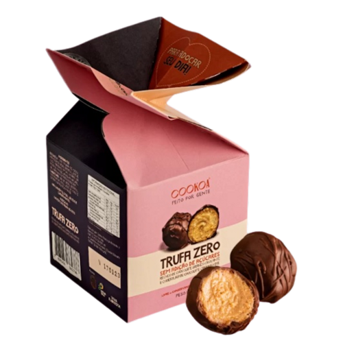 A Trufa Zero com Ganache Branco Cookoa é a combinação dos chocolates zero açúcar, cremoso 54% cacau por fora e branco com castanhas por dentro. Crocante e cremosa, sem nadinha de açúcar. Uma perfeição!