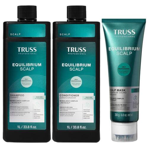 Truss Equilibrium Scalp Kit Shampoo Condicionador 1L e Máscara 250g SHAMPOO EQUILIBRIUM SCALP Shampoo anticaspa com pH adaptado ao couro cabeludo, limpa profundamente, remove impurezas e controla a oleosidade. Sua fragrância fresca de Neroli, Bergamota e Flor de Laranjeira proporciona uma experiência sensorial revigorante. Limpeza profunda; Controle da oleosidade; Fragrância refrescante. Tecnologia Scalp Reboost. Como usar Aplique o shampoo sobre os cabelos molhados, massageie suavemente e enxágue. Repita a operação se necessário. CONDICIONADOR EQUILIBRIUM SCALP Condicionador que previne o ressecamento das pontas e hidrata os fios sem pesar. Com fragrância fresca de Neroli, Bergamota e Flor de Laranjeira, proporciona maciez e desembaraço. Hidratação intensa; Maciez e desembaraço; Fragrância refrescante. Tecnologia Scalp Reboost. Como usar Após o uso do shampoo, retire o excesso de água dos fios e distribua o condicionador no comprimento e pontas. Massageie, desembarace, deixe agir por 2 minutos e enxágue. A Máscara de Couro Cabeludo Equilibrium Scalp acalma e promove sensação de alívio para o couro cabeludo, amenizando desconfortos e irritações.. Com fragrância fresca de Neroli, Bergamota e Flor de Laranjeira, ele faz do seu momento de cuidado uma experiência ao mesmo tempo, relaxante e revigorante. Modo de uso Após o uso do shampoo, com os cabelos molhados, aplique a Máscara diretamente no couro cabeludo, em movimentos circulares com o auxílio do acoplado na embalagem. Para abrir o aplicador, gire a tampa da bisnaga até a opção ON. Espalhe por toda a região massageando suavemente, deixe agir por 10 minutos e depois enxágue. Para fechar o aplicador, gire a tampa para a opção OFF. Marca: Não Informado