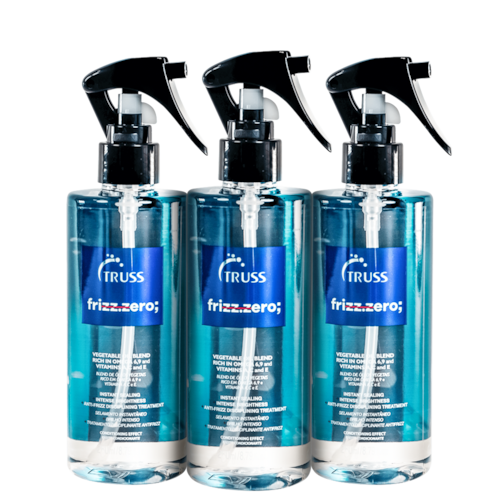 Kit com 3 condicionadores para cabelos equilibrados. Truss Frizz Zero Condicionador pode ser utilizado como pré-shampoo ou máscara líquida nas lavagens.